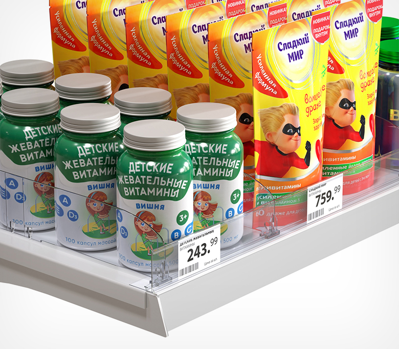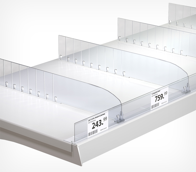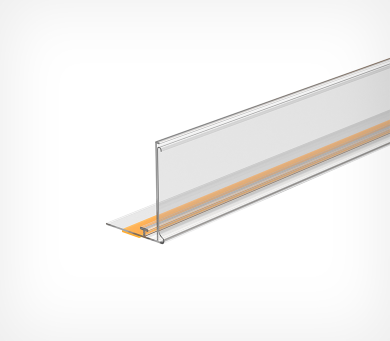 Крепится на передний край полки, где он может применяться как передний ограничитель товаров. Дополнительно, он используется как Т-профиль, на который можно монтировать разделители и толкатели для более удобной организации товаров на полках.