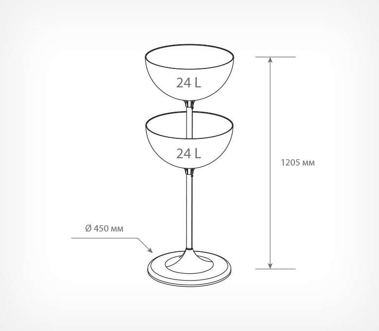 Дисплей состоит из двух прозрачных пластиковых чаш объемом 24 и 24 литра; металлической опорной «ноги» (2 части) и устойчивого пластикового основания. Чаша для выкладки является цельнолитой, что гарантирует её долгую эксплуатацию.