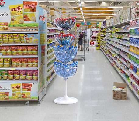 Напольный дисплей с четырьмя чашами 17/17/24/24 литра. Четырехуровневый дисплей состоит сразу из четырех чаш разных объемов. Благодаря этому дисплей позволяет делать выкладку сразу четырех товаров и ещё более эффективно использовать торговую площадь, увеличивая продажи. Дисплей состоит из двух прозрачных пластиковых чаш объемом 17 и двух чаш объемом 24 литра; металлической опорной «ноги» (2 части) и устойчивого пластикового основания. Чаша для выкладки является цельнолитой, что гарантирует её долгую эксплуатацию. Стандартный цвет основания и труб – белый. Другие цвета по запросу. Дополнительные опции – держатели информации и разделители внутри чаш на 24л. (нижняя) и 17л. (верхняя) поставляются отдельно.