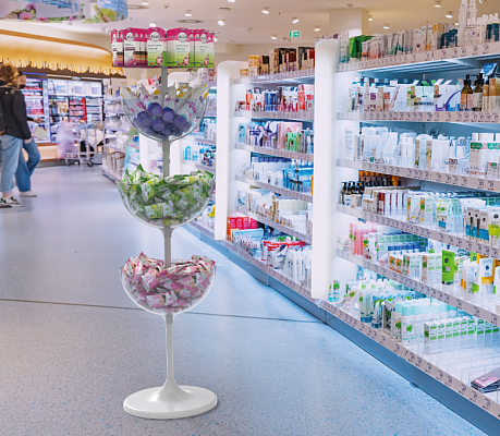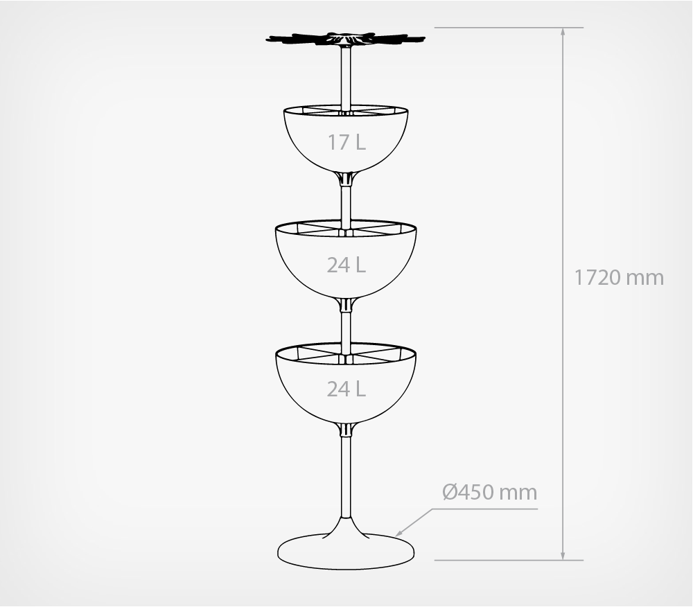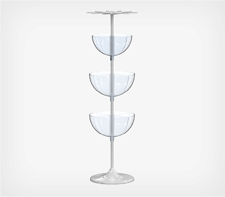 Напольный дисплей с тремя чашами 17/24/24 литра и держателем 12 крючков с разделителями. Трехуровневый дисплей состоит сразу из трех чаш разных объемов. Отлично подходит для выкладки продовольственных и непродовольственных товаров в неустойчивой и компактной упаковке в чашах и в упаковке с широкой петлей (европетля) для подвешивания на двенадцати крючках. Дисплей состоит из прозрачной пластиковой чаши объемом 17 и двух чаш объемом 24 литра; металлической опорной «ноги» (2 части) и устойчивого пластикового основания. Чаша для выкладки является цельнолитой, что гарантирует её долгую эксплуатацию. Стандартный цвет основания и труб – белый. Другие цвета по запросу. Дополнительные опции – держатели информации и разделители внутри чаш на 24л. (нижняя) и 17л. (верхняя) поставляются отдельно.